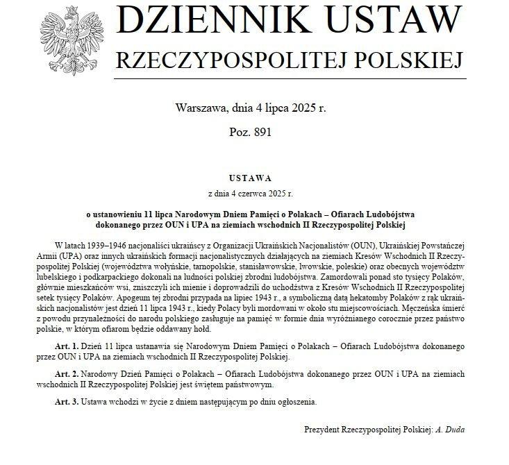 […] Tegoroczne obchody dnia pamięci Polaków – Ofiar ukraińskiego ludobójstwa mają charakter szczególny, gdyż 5 lipca weszła w życie ustawa Sejmowa z dnia 04 czerwca 2025 r.